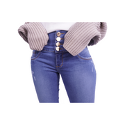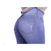 Radia : Jean Azul Claro, cuenta con 4 botones, tiro alto con cintura ajustada, bota ceñida al cuerpo, es un jean lizo. Tiene horma realza glúteo. Cómodo y flexible. La modelo mide 1.58 y usa talla 8.