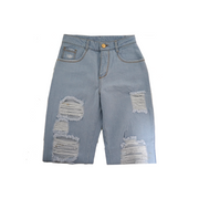 Jean 481: tono azul claro, bota ancha, 2 bolsillos, con grandes desgastes, tiro alto, con cintura configurada.