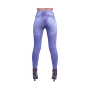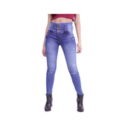 Jamal: Jean tono Azul Medio, con desgastes a los lados, con una iluminación en el centro, tiro alto con cintura ajustada y con 4 botones. Cómodo y flexible. La modelo mide 1.58 y usa talla 8.