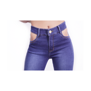Karim: Jean tono azul semi oscuro, con aberturas en la cadera, señido al cuerpo, tiro alto, la horma realza el glúteo, cuenta con un botón y 2 bolsillo. Cómodo y flexible. La modelo mide 1.58 y usa talla 8.